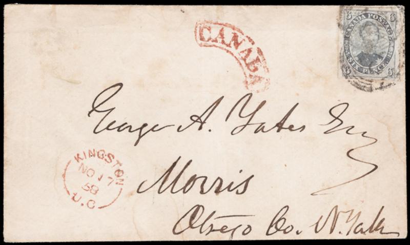 CANADA, 1858, 6p SLATE GREY USED ON COVER, #6, large margins, tied by black circular numeral cancel on Nov., 1858 cover to Morris, N.Y., red Kingston d.s., red "CANADA" in arc, letter enclosure, cover with faint age staining mostly on back, fine-very fine, with 2025 PSAG cert., cat. $1,700.00 (Image)