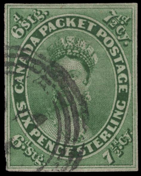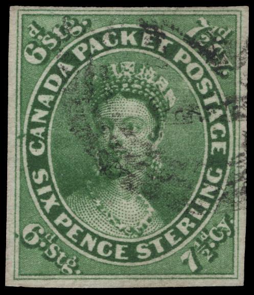 CANADA, 1857, 7½p GREEN USED, #7, full margins, neat partial numeral cancel, very slight diagonal crease, very fine, cat. $3,250.00 (Image)