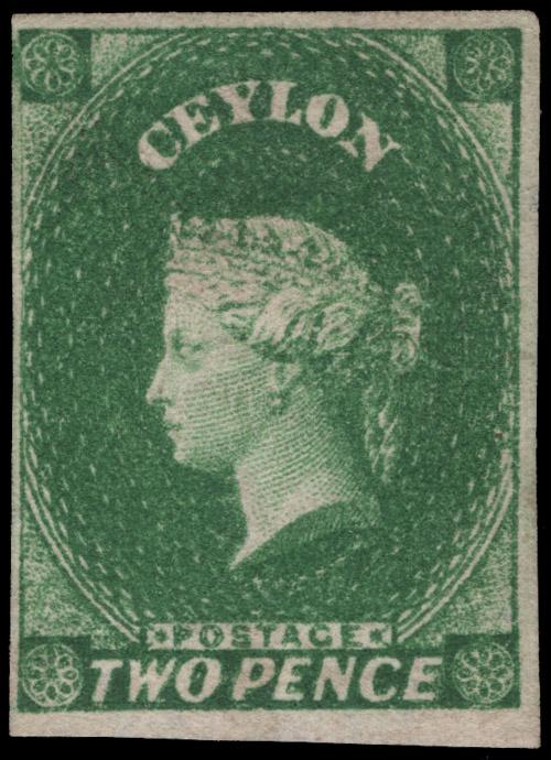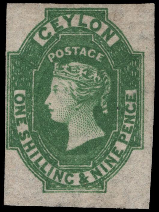 CEYLON, 1859, 1sh9p GREEN MINT, #12, clear to large margins, traces of o.g., fine-very fine, cat. $1,000.00 (Image)