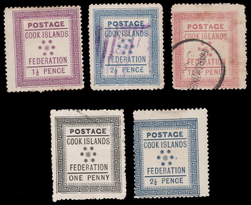COOK ISLANDS, 1892, FIRST ISSUE GROUP, #2//7, 2-4, 5, 7, toned paper 1½p mint, 2½p and 10p both used, white paper 1p used and 2½p mint, small flaws due to the delicate soft paper, cat. $322.50 (Image)
