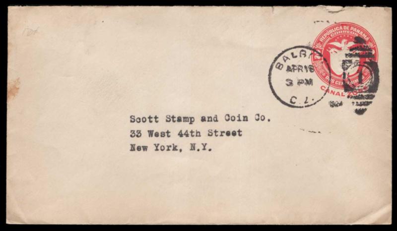 CANAL ZONE, 1923, 2c CARMINE ENTIRE USED TO NEW YORK, #U5, indicia tied by Apr., 1924 Balboa, C.Z. duplex, minor corner crease, fine-very fine, cat. $125.00 (Image)
