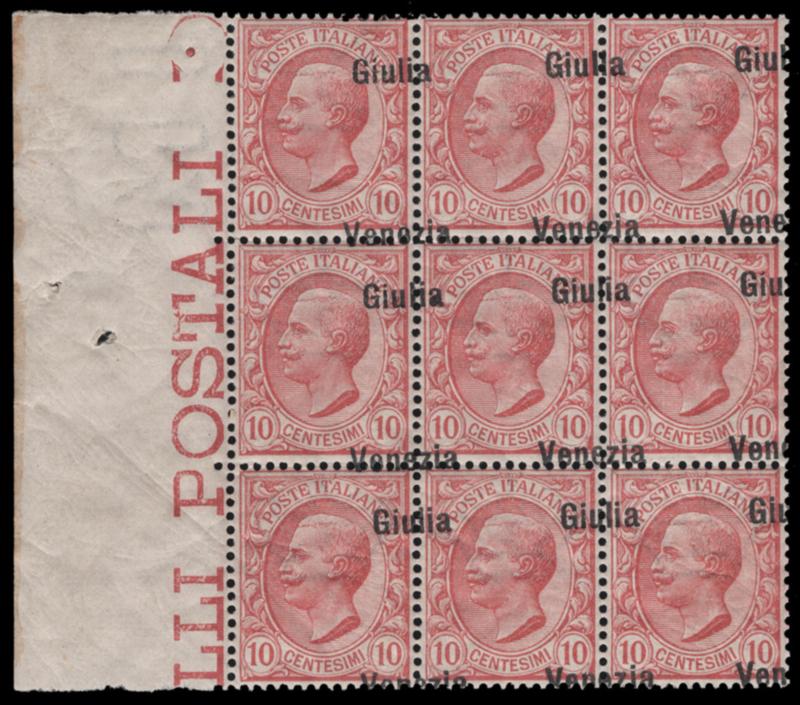 AUSTRIA ITALIAN OCCUPATION OF TRIESTE, 1918, 10c CLARET - OVERPRINT SHIFTED UP AND SIDEWAYS - MINT NEVER HINGED BLOCK OF NINE, N23 var., overprint shifted in both directions, fresh, fine-very fine, scarce variety, cat. Sassone 22cb @ €4,950.00 as NH singles (Image)