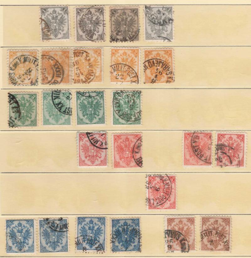 BOSNIA & HERZEGOVINA, 1879-1994, , FIRST, SECOND & THIRD COAT OF ARMS COLLECTION ON PAGES USED, detailed collection of about 400 organized by postmark & perforation, reprints, wide variety of postmarks, including military postmarks from Sarajevo, Mostar, Livno, Srebenica, types of cancels include manuscript cancels, single circles, double circles, squares, ovals, octagons, variety of perforations, descriptions written in German on pages, fresh and fine-very fine. (Image)