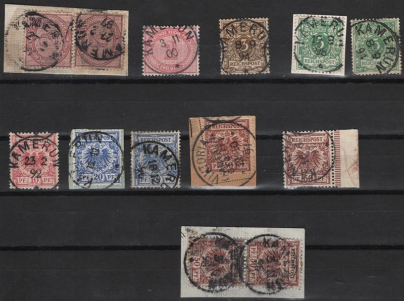 GERMANY USED IN CAMEROUN, 10 singles or pairs, all with "Kamerun" cancels 1892-1900, incl. Michel #V37 (both signed), V45a (signed Steuer BPP), overall fine-very fine, most signed, cat. Michel €945.00 (Image)