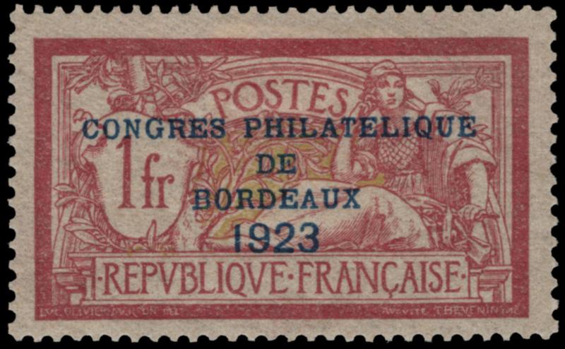 FRANCE, 1923, 1fr BORDEAUX PHILATELIC CONGRESS MINT, #197, well-centered, h.r., very fine, signed Calves, cat. $440.00, Yvert #182 @ €600.00 (Image)