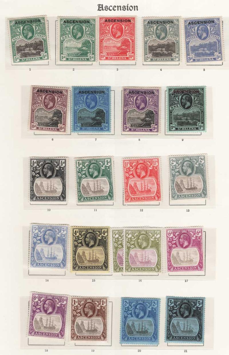 ASCENSION 1922-35 MINT ON ALBUMPAGES, #1-9, 10-21, 23-32, 33-36, fresh, o.g., LH or h.r., fine-very fine, cat. $1,073.00 (Image)