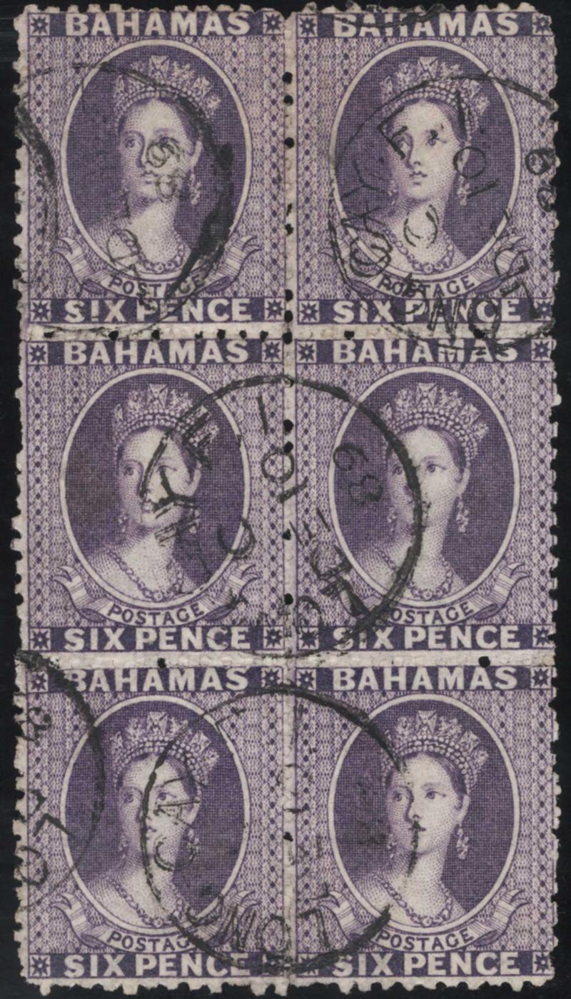 BAHAMAS, 1863-80, 6p DARK VIOLET PERF 12½ WMK CROWN CC BLOCK OF SIX USED, #14, Long Kay F.I. d.s., part of margin watermark, minor internal wrinkles, quite attractive, with 1973 BPA cert. (Image)