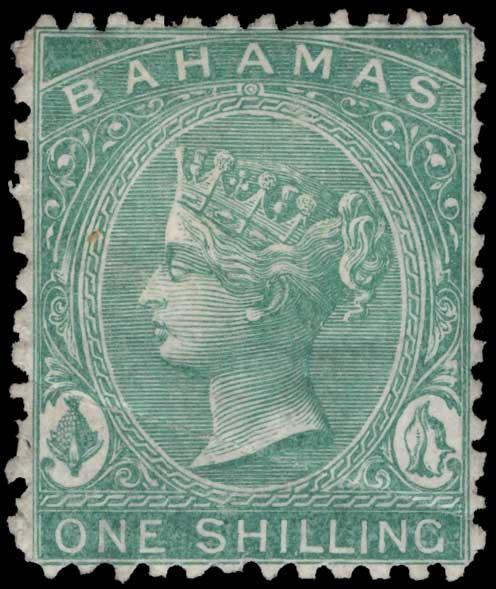 BAHAMAS, 1865, 1sh GREEN PERF 12½ MINT, #15, unusually well-centered for this issue, o.g., h.r., slight horizontal crease not noted on cert., very fine, wth 1980 SPA cert., cat. $3,250.00, Gibbons #38 @ £2,750.00 (Image)
