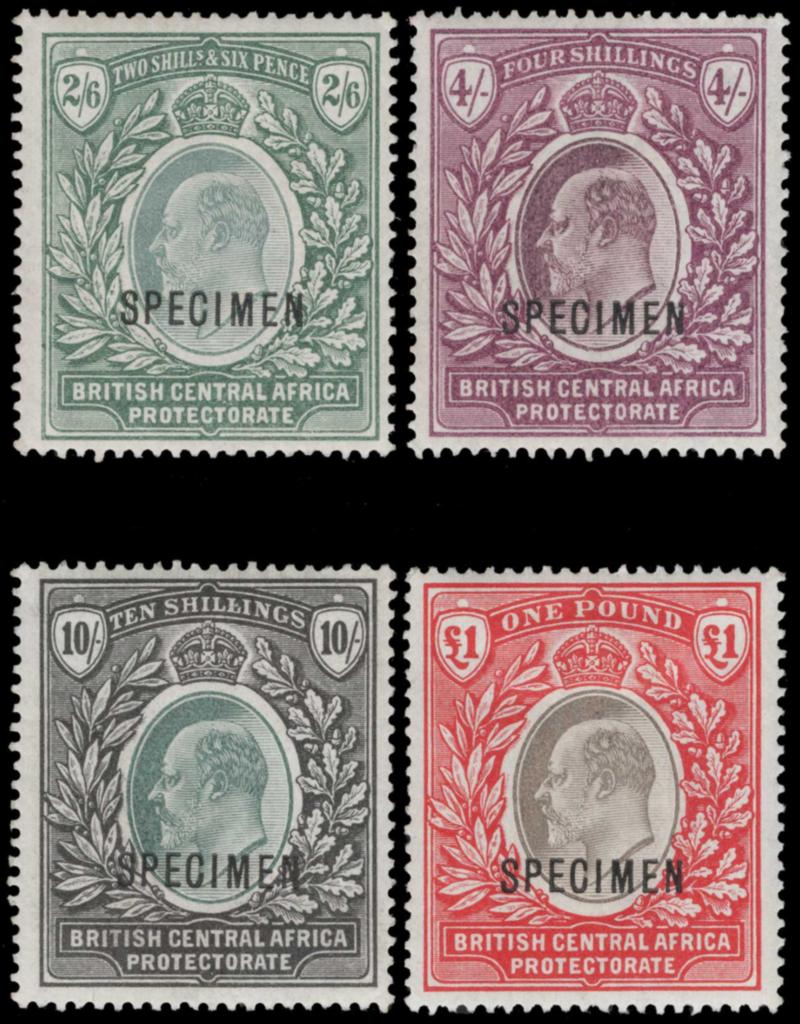BRITISH CENTRAL AFRICA, 1903, 2sh6p-£1 EDWARD VII WITH "SPECIMEN" OVERPRINT, #65-68S, lightly hinged, fine-very fine (Image)