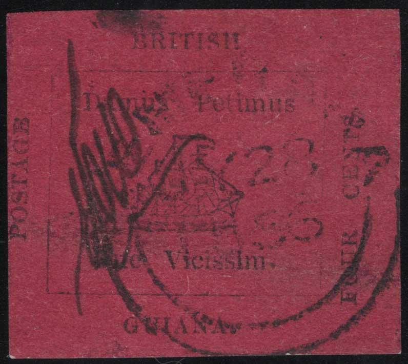 BRITISH GUIANA, 1856, 4c BLACK ON MAGENTA USED, #14, cut-to-shape, signed "EDW" by Wight, Jan. 25, 1856 Demerara circular datestamp, faults including thins, great spacefiller for a rare stamp issue, cat. $28,750.00, Gibbons #24 @ £25,000.00 (Image)