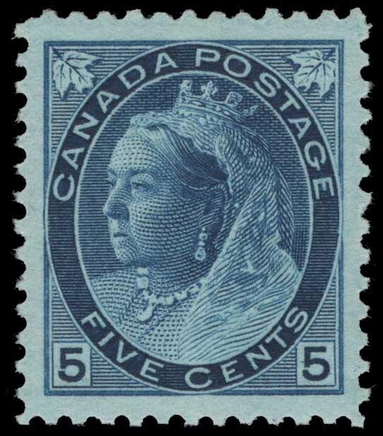 CANADA, 1897, 5c BLUE JUBILEE MINT NEER HINGED, #54, exceptionally well-centered, extremely fine - superb, with 2019 PF cert., SMQ $500.00 (Image)