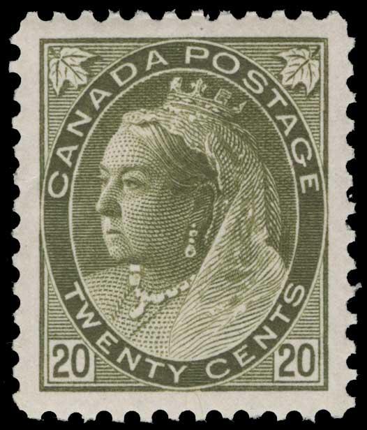 CANADA, 1900, 20c OLIVE GREEN MINT NEVER HINGED GRADED '98J', #84, virtually perfectly centered amidst extra wide margins, rich color, minor natural gum wrinkle, superb jumbo, with 2019 CPES cert graded '98J', unpriced in this lofty grade in the SMQ. highest grade priced is '95' at $3,400.00, a spectacular stamp (Image)