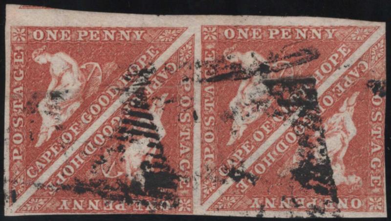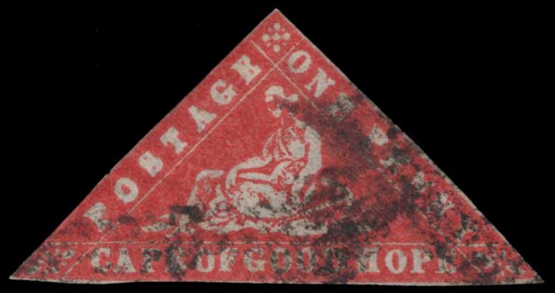 CAPE OF GOOD HOPE, 1861, 1p CARMINE "WOODBLOCK" USED, #7a, margins to in, filled in thins, with 2002 Sissmondo cert., cat. $4,000.00, Gibbons #13a @ £4,000.00 (Image)