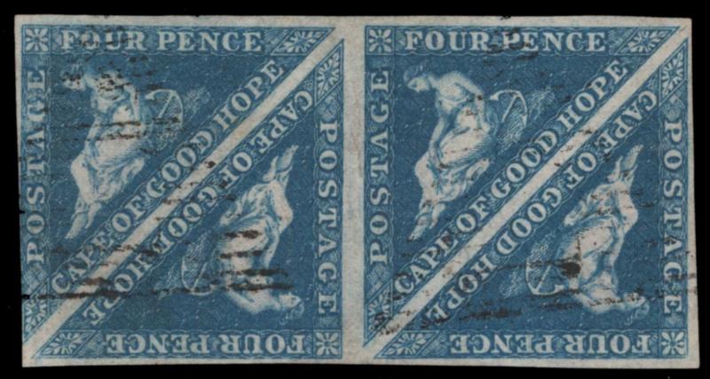 CAPE OF GOOD HOPE, 1855, 4p BLUE BLOCK OF FOUR USED, #4, full margins, just in at right, light cancel, attractive, fine-very fine, cat. $650.00 (Image)