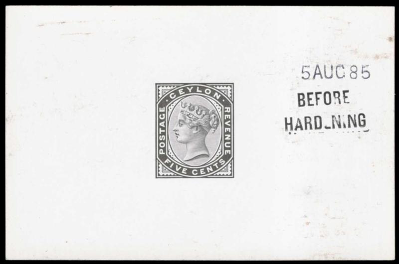 CEYLON, 1886, 5c VICTORIA DIE PROOF IN BLACK, #131P, Gibbons #195P, struck on on 92x61mm on white glazed card, datestamped "5 AUG 85", endorsed 'BEFORE HARDENING", very fine (Image)