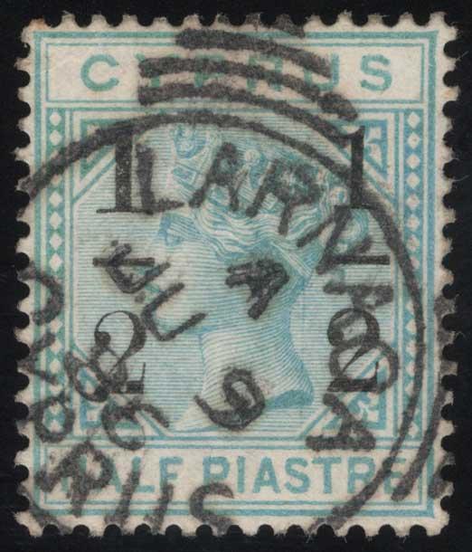 CYPRUS, 1886, ½p on ½p GREEN WMK CROWN CC - LARGE "1" AT LEFT IN SURCHARGE VARIETY - USED, #27 var., well-centered, socked-on-the-nose Larnaca d.s., very fine, scarce variety, with 2007 Sissmondo cert., cat Gibbons #28a @ £2,250.00 (Image)