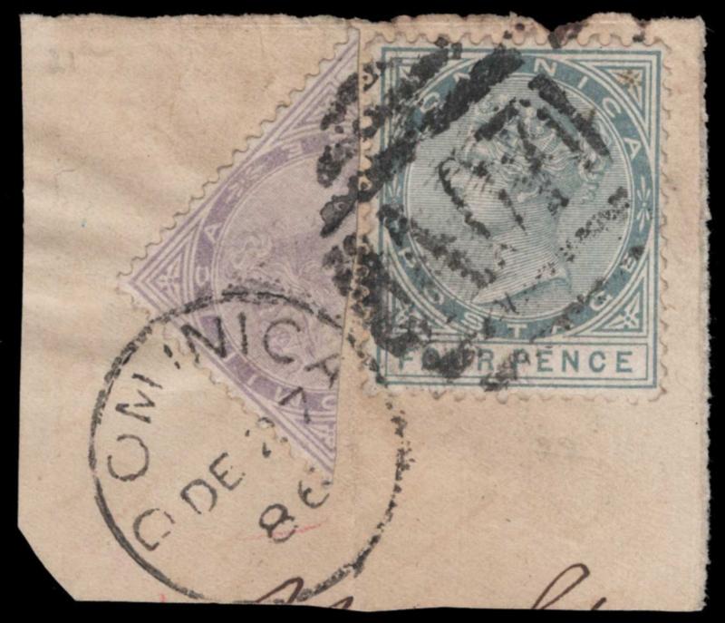 DOMINICA, 1886, 1p LILAC BISECT USED AS ½p with 4p GRAY ON SMALL PIECE, #18a, 22, tied by Dec. 27, 1886 "A07" duplex, fine-very fine, cat. $2,350.00, Gibbons #14a @ £2,250.00, both values for full cover (Image)