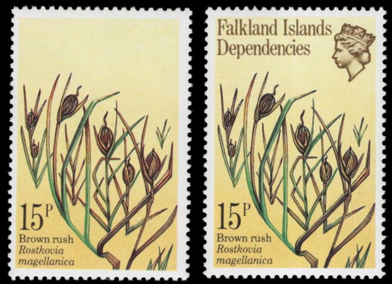 FALKLAND ISLANDS DEPENDENCIES, 1981, 15p BROWN RUSH ERROR - BROWN QUEEN'S HEAD AND COUNTRY NAME MISSING - NH, #1L57a, normal included for comparison, fresh, very fine, scarce error, with 2016 Sismondo cert., cat. $4,250.00 (Image)