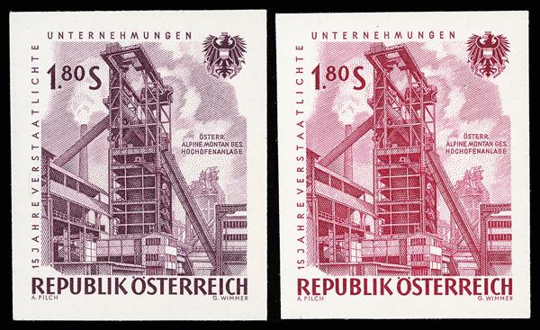 1961, 15th Anniversary of Nationalized Industry, 1.80S Blast Furnace (Scott 670), two well-centered and sound Trial Color Proofs, imperforate without gum as issued, each bright and appealing, Very Fine. Michel 1092 P U; €800 ($860). (Image)