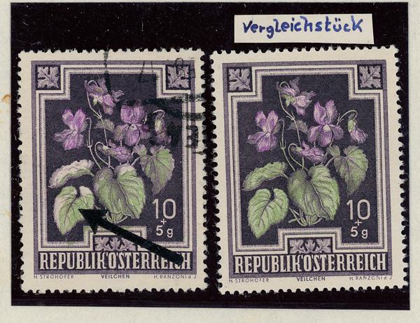 1948, Flowers, 10g+5g, green strongly shifted (Scott B235 var.), attractively centered with unobtrusive corner cancel, alongside unused normal tor comparison, Very Fine, extremely rare thus; Michel's Austria Specialized catalogue does not list the item used, the Frischer "certificate" noting this as the discovery example, with undated Norbert Frischer opinion. Michel 868 F; €700 for never hinged ($760). (Image)