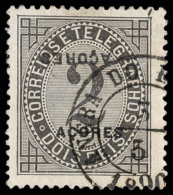 Newspaper Stamp, 1885, 2r black, double overprint, one inverted (Mundifil #51 var) (Scott P3b), neat double circle Angra c.d.s.; single nibbed perforation at the left (not mentioned on certificate), otherwise Very Fine and rare. Unpriced by Scott, 2024 ISPP certificate. (Image)