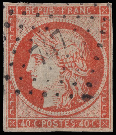 1849, Ceres, 40c orange on yellowish (Scott 7), small, even margins, bright color and a neat Charenton-le-Pont "747" small numeral cancel; thinned, Fine to Very Fine appearance. Yvert 5; €500 ($540). Scott $360. (Image)