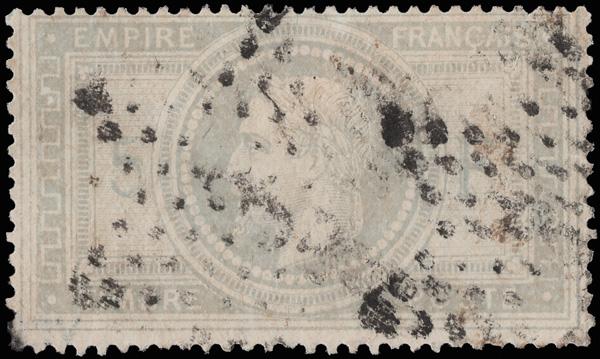 1869, Napoleon III Laureate, 5fr gray lilac on lavender (Scott 37), canceled with two Place de la Madeleine "3" Paris stars; handstamp on lower left corner perf bleeds through to the front, otherwise Fine. Yvert 33; €1,100 ($1,190). Scott $750. (Image)