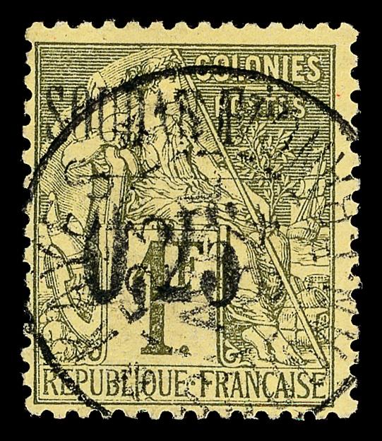 1894, 25c on 1f bronze green (Scott 2), clean with bold color and maximal postmark; surcharge punctures face resulting in internal tear, otherwise Very Fine, 950 issued, signed Miro. Scott $1,700. (Image)