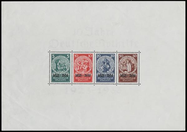 1933 Nothilfe souvenir sheet (Scott B58), unused without gum, fresh and exceptionally well centered; small thin and bends in margins, otherwise Very Fine. Michel Block 2. Scott $1,150 for o.g. (Image)