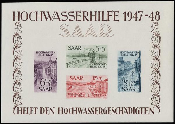 1948, Flood souvenir sheet (Scott B64a), a pristine mint sheet, o.g., never hinged, Extremely Fine. Scott $325 for hinged. Michel Block 1. Michel €1,100 ($1,190). (Image)