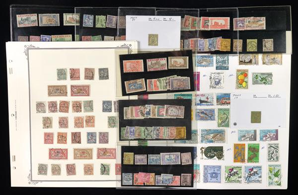 French Colonies, North Africa collection 1888-1954, Scott album pages, black stock cards, and a pair of folders with hinged used North African stamps; at least 100 different used from Tunisia on cards and hingless pages; a few hundred different Morocco principally in sets including Air Post, Officials, and Tangier; attractive, Fine to Very Fine. Shipping charges apply - weight 2.2 lbs. (Video for this lot) (Image)