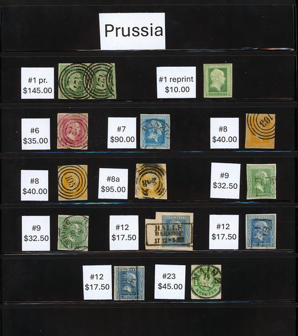 Prussia, Early German States classics 1850-1861, 14 stamps (one is a reprint) from Prussia on a black Vario page; includes #1 (pair) plus reprint, 6, 7, 8 (2), 8a, 9 (2), 12 (3), and 23; beautiful examples, CV $615, Fine to Very Fine. (Image)