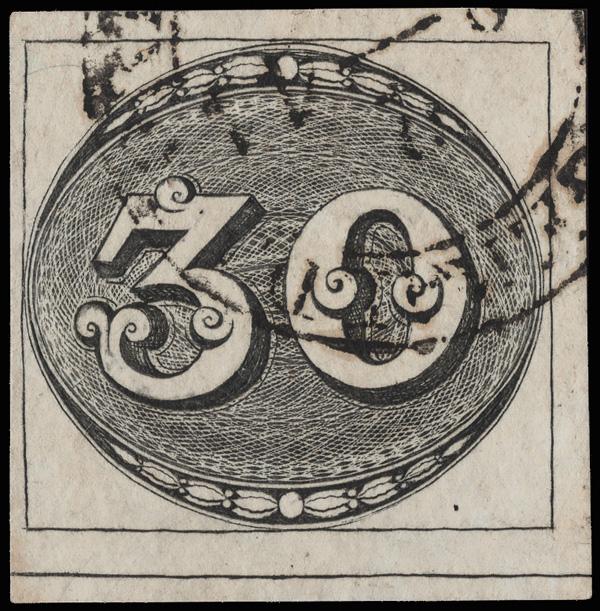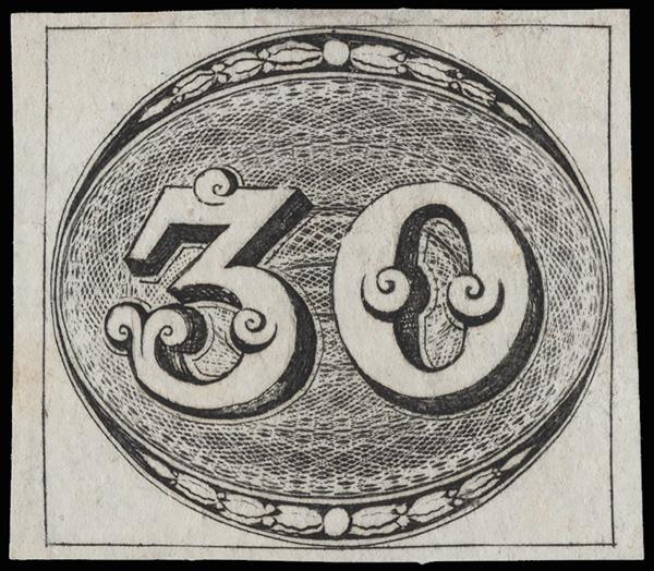 1843, First Issue ("Bull's Eye"), 30r black, worn impression (Scott 1b), unused without gum (as listed), four nice margins; couple fain horizontal pressed creases, Very Fine appearance, signed Bernichon. Scott $4,000. (Image)