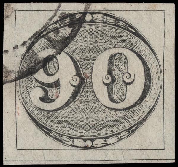 1843, First Issue ("Bull's Eye"), 90r black, worn impression (Scott 3b), an exceptional example with large to oversized margins and a neat corner cancel, Extremely Fine, signed Pfenninger, J. Schlesinger, with a 2024 P.F. certificate. Scott $1,250. (Image)