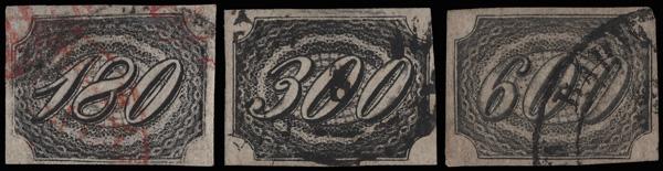 1844-46, Second Issue ("Cat's Eyes"), 10r-600r less the 90r (Scott 7-9, 11-13), including an extra 30r; a nice, completely sound group, the three high values close but clear on one side, Fine to Very Fine, to Very Fine, the 300r & 600r with 2024 P.F. certificates. Scott $6,320. (Image)