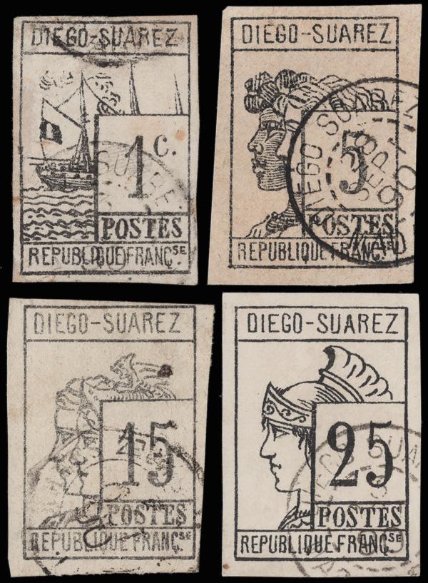 1865, Coat of Arms Medallion, 1/3gr-3gr serpentine roulette complete (Scott 23-26), a fresh, well centered, neatly canceled set; the 2gr with clipped roulette at the top, otherwise Very Fine to Extremely Fine. Scott $685. (Image)