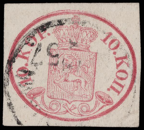 1856, Coat of Arms, small pearls, 10k rose on wove paper (Scott 2), nice margins and light partial 1857 town cancel; couple small thins, Very Fine appearance. Michel 2 x. Facit 2. Scott $700. (Image)