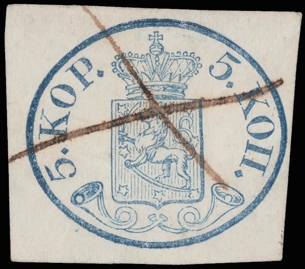1858, Coat of Arms, large pearls, 5k blue on wove paper (Scott 3), exceptionally fresh with three huge margins and an adequate fourth, neatly pen-canceled; "two tiny thin specks" per the accompanying certificate, Very Fine appearance, with a 2025 P.F. certificate. Michel 1 II. Facit 1II. Scott $1,200. (Image)