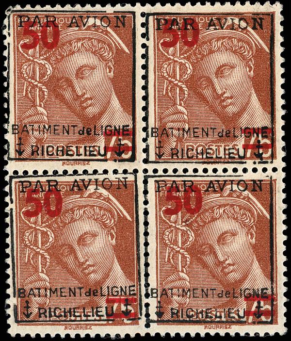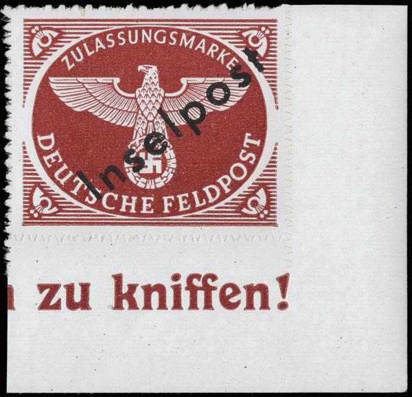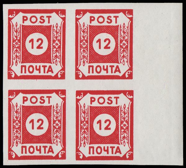 1945, 12 (pf) "Post/Pochta" (Scott 15N1), a choice right sheet margin block of 4, o.g., never hinged, Extremely Fine, each stamp signed DR. Dub. Michel B Ia; €2,400 as singles ($2,590). Scott $1,600 as singles. (Image)