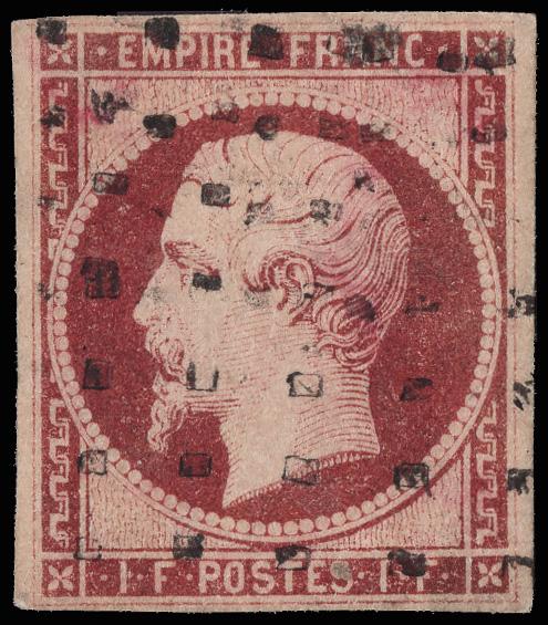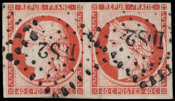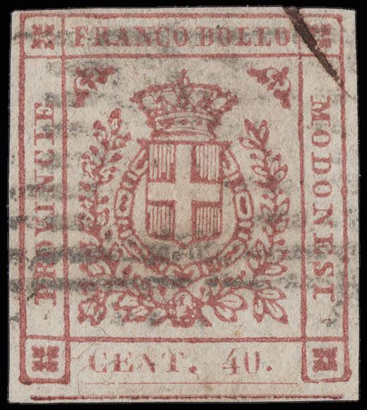 1859 Provisional Govt. 40c carmine (Scott 13a), ample to large margins with a light 6-bar cancel; tiny thin and small corner crease, the latter where an extraneous pen stroke crosses the stamp, Very Fine appearance, with a 2024 P.F. certificate not noting the corner crease. Sassone 17c. Scott $1,450. (Image)