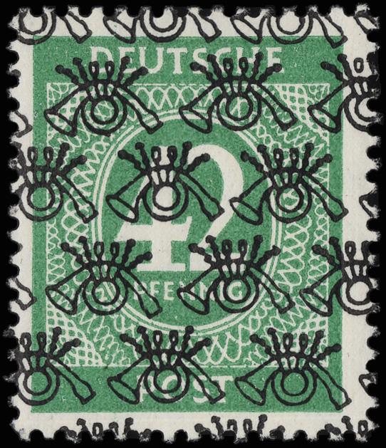 1948, Unissued 1pf-80pf Numerals, Posthorn "carpet" overprint errors (Michel VII/II K, I/II DD//IX/II DD), the 42pf with an inverted, the rest with double overprints, o.g., lightly hinged, Very Fine, signed Bohne/GPSY, Schlegel BPP, or Becker. Michel €2,220 for NH ($2,400). (Image)