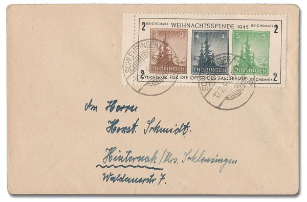 1945 Christmas Fund souvenir sheet of 3 (Scott 16N3a), tied on a locally addressed cover by two Schleusingen c.d.s.s, Feb 12, 1946, Very Fine. Michel Block 1x; €2,500 ($2,700). Scott $725 ++. (Image)