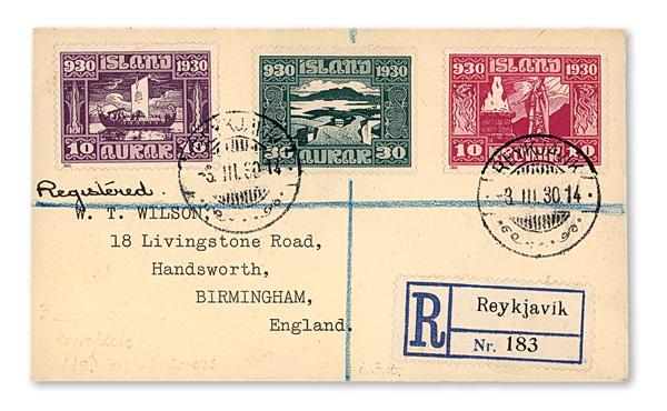 1930, Parliament Millennium regular issues, 3a to 10kr complete (Scott 152-166), on four Mar. 3, 1930 Registered covers from Reykjavik to Birmingham, England; each cover franked by three or four stamps, blue crayon-crossed with blue-on-white Reykjavik Registry label, the stamps tied by bridge-type cancels, Very Fine. Michel 125-139. Facit 173-187. Scott $956 as used singles. (Image)
