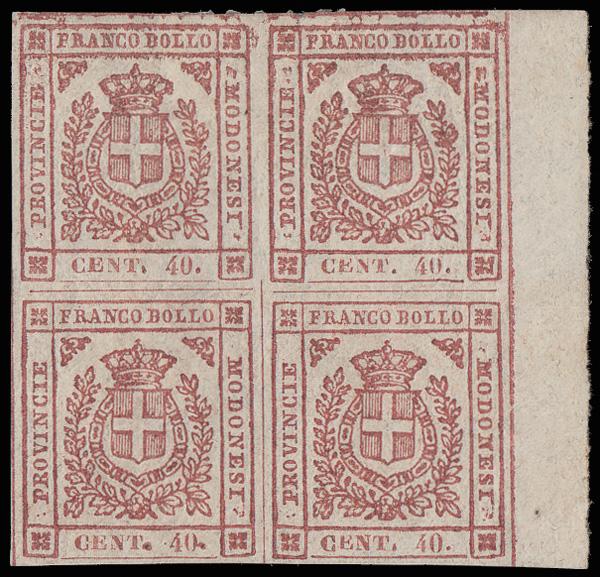 185? ½b black on gray lilac (Scott 1 var.), an exceptional block of 4 tied by one of two lozenge cancels on a folded letter from Rome to Ripatransone, 13 Feb 1864; the block has a frame line on all sides with a small part of the sheet margin at the right; the cover is fresh and clean with a handstamped "2" rate and four different backstamps, Very Fine to Extremely Fine. Sassone values the normal 1864 grayish violet (1A) block of 4 on cover at 21,000€ whereas the price of a single on cover is half that of the gray lilac (1c)., signed G. Biondi & A. Diena, with a 2019 Biondi certificate. Sassone 1c.