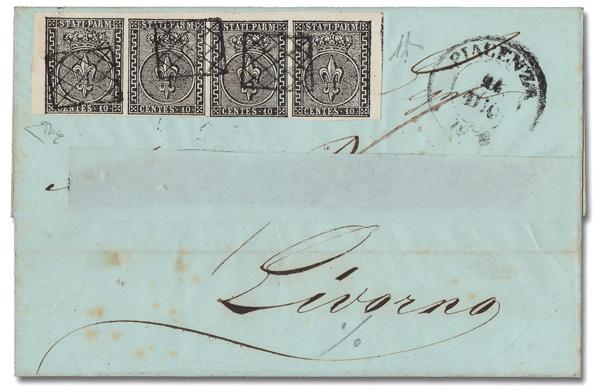 1852, 10c black on white (Scott 2), a lovely horizontal strip of 4 with three large margins and barely shaved at the bottom of the third stamp, canceled by three neat rectangular grills on a folded letter from Piacenza to Livorno, 24 Dec 1852, backstamped Livorno, 26 Dec; bit of minor foxing (not affecting stamp) and name of addressee covered up, otherwise Very Fine, signed A. Diena & E. Diena, with 1958 Diena certificates. Sassone 2. Sassone €36,000 ($38,880).