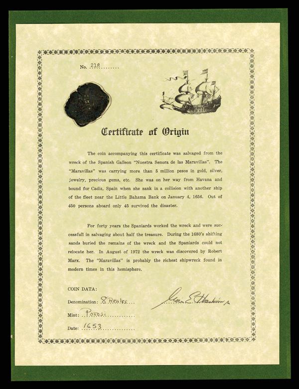 1653 8 Reales Potosi Silver Shipwreck Coin, coin salvaged from the wreck of the Spanish Galleon "Nuestra Senora de las Maravillas"; please inspect; coin attached to COA. Shipping charges apply - weight 1 lbs. (Image)