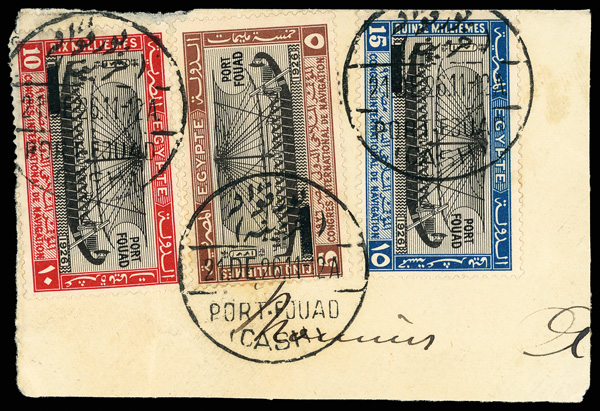 1926, 5m-15m International Navigation Congress, "PORT FOUAD" overprints, First Day-cancelled (Scott 121-123), each a bright single tied by bilingual "Port Fouad/(Cash)" bridge cancel dated 21 DE 26; 15m with blunted perforations thanks to placement, the 10m value with semi-circle/dot guide mark in lower left corner, Very Fine, signed Hass. Scott $750 used off-piece. (Image)