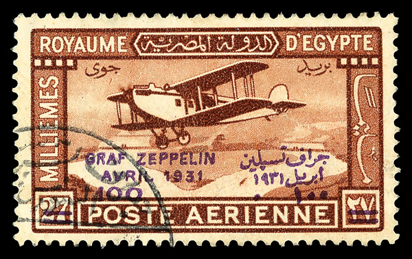 1931, 100m on 27m Zeppelin, violet overprint, partial Suez Zeppelin datestamp (Scott C4), fresh and bright with unobtrusive Suez cancel—the rarest Zeppelin Egypt flight—almost never encountered on single stamps, with only a few covers known, Very Fine. Nile Post C37. (Image)