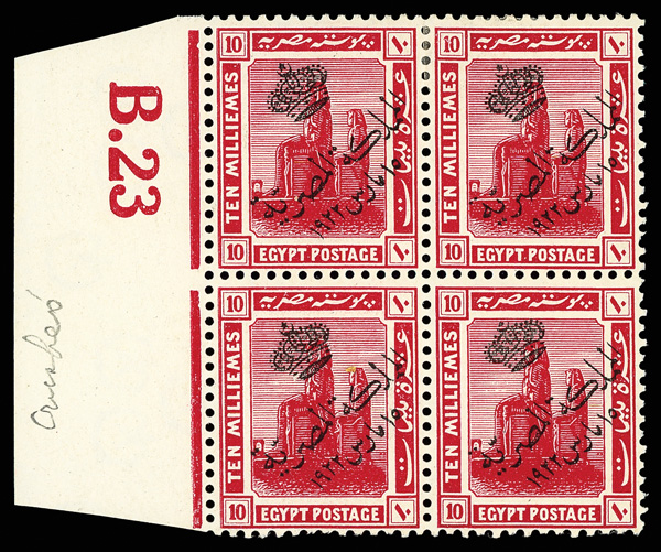 1922, 2m vermilion, 4m green, 10m lake, Colossi of Thebes, "crushed crown" variety (Scott 79, 81, 83), trio of matched left margin blocks, the variety (position 192) the bottom right stamp on each; 2m never hinged, others with hinge remnant on top stamps, Very Fine, 2m signed Hass. Nile Post D79Ih, D81Id, D83Ie; $2,350 as blocks of six. (Image)