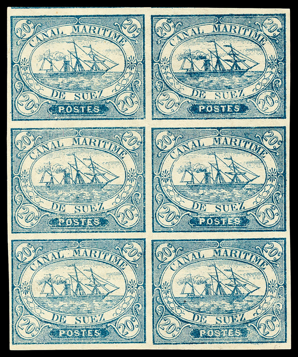 Suez Canal Company, 1868, 20c blue (Scott L3), positions 45-46/57-58/69-70, vertical block of 6, o.g., never hinged, fresh with crisp impression in rich color and full margins all around; light bend through bottom horizontal pair, otherwise Very Fine, signed Hass. SG 3. Nile Post SC3. Scott $540 as singles. (Image)